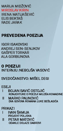 Miroslav Kirin (1965, Sisak, Hrvatska) objavio je zbirke poezije Od nje do vječnosti (1989, Goranova nagrada), Tantalon (1998), Zukva (2004), Iza renesanse (2004), Jalozi (2006), Zbiljka (2009), Zenzancije (2012). Objavio je knjigu autobiografske proze Album (2001), po kojem je snimljen dokumentarni film (režija Branko Ištvančić, 2011) i knjigu eseja Iskopano (2012).